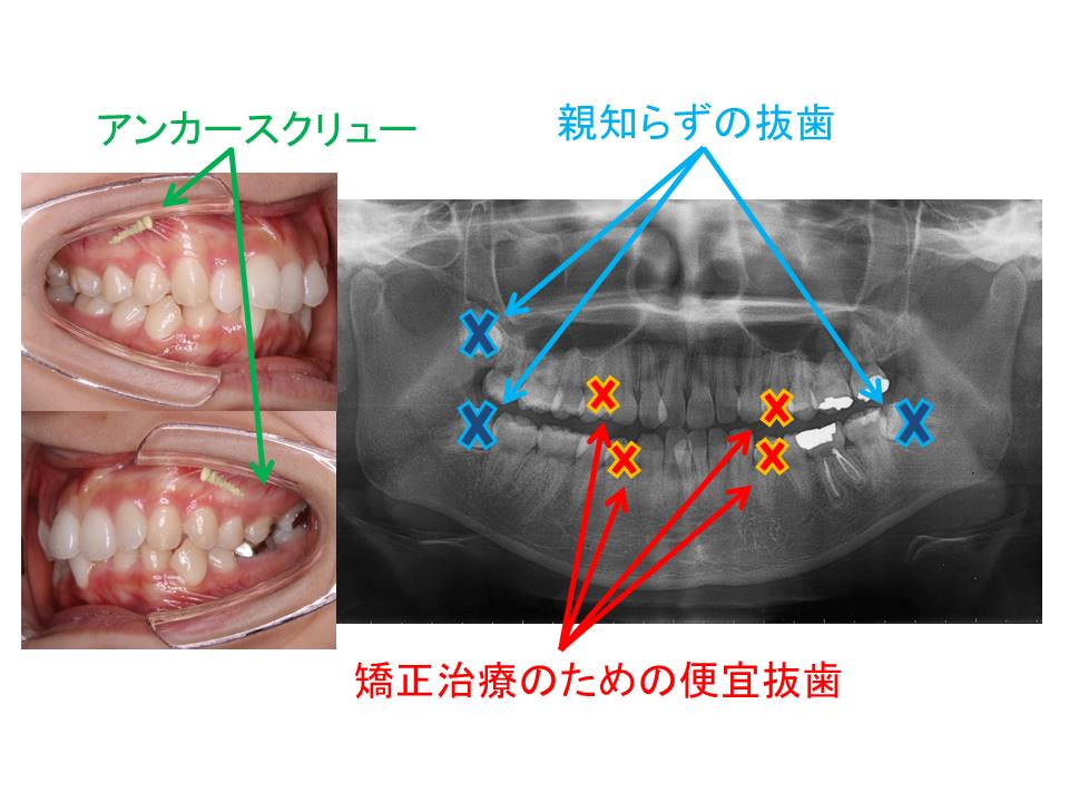 矯正方法:ワイヤー矯正、上顎にアンカースクリューの植立(2本)