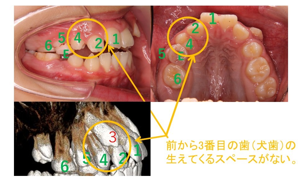 もともと大人の歯の卵の位置が通常の位置と違うところにあり、生えてくるのが困難となっている。
