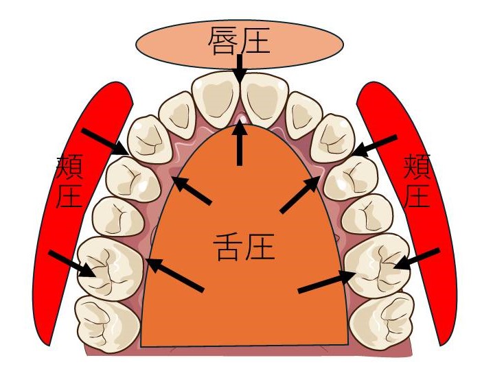 歯は、舌の押す力と頬や唇からの押し戻す力のバランスによって、一定の位置に保たれています。このバランスを説明するのが「バクシネーターメカニズム」です。