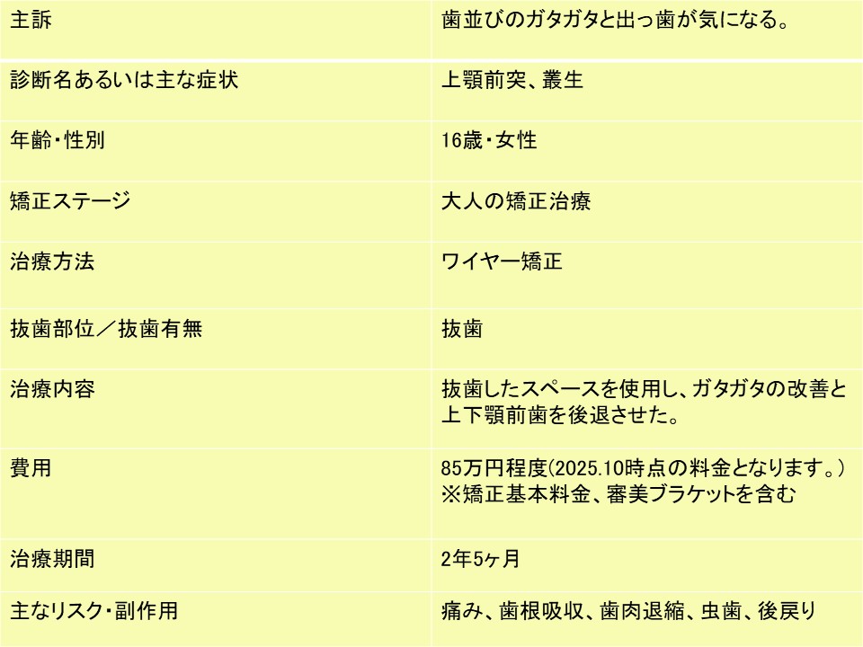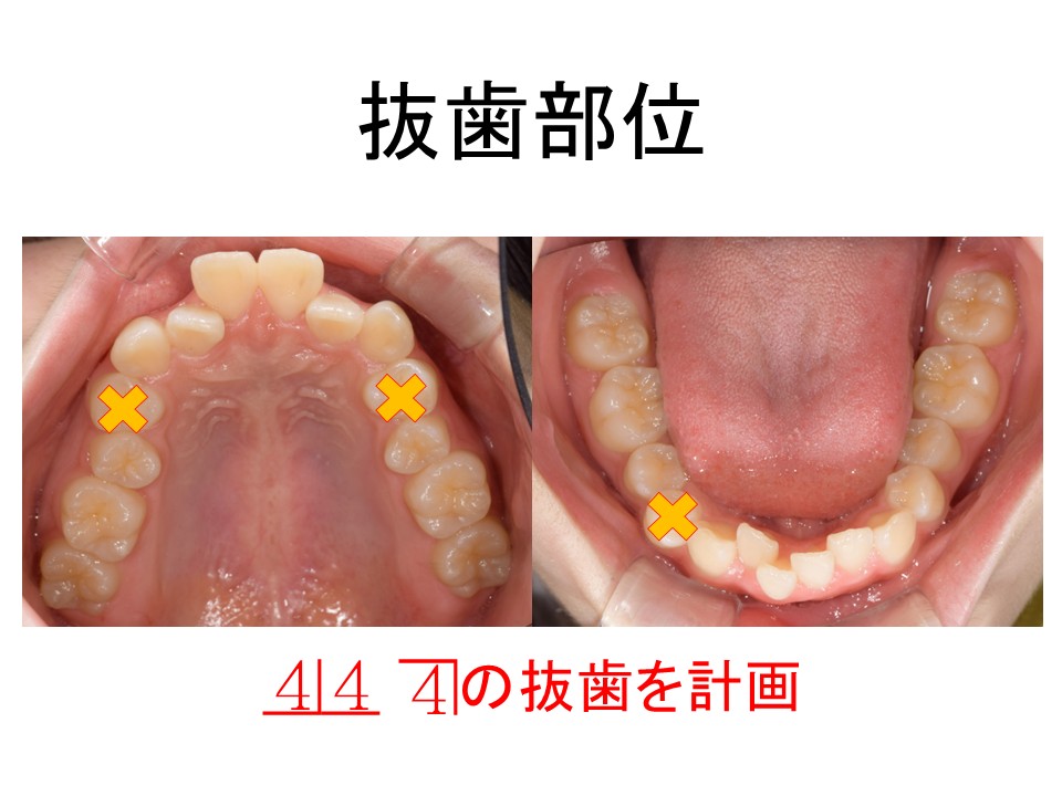抜歯部位:上顎両側第一小臼歯、下顎右側第一小臼歯の計3本の便宜抜歯。