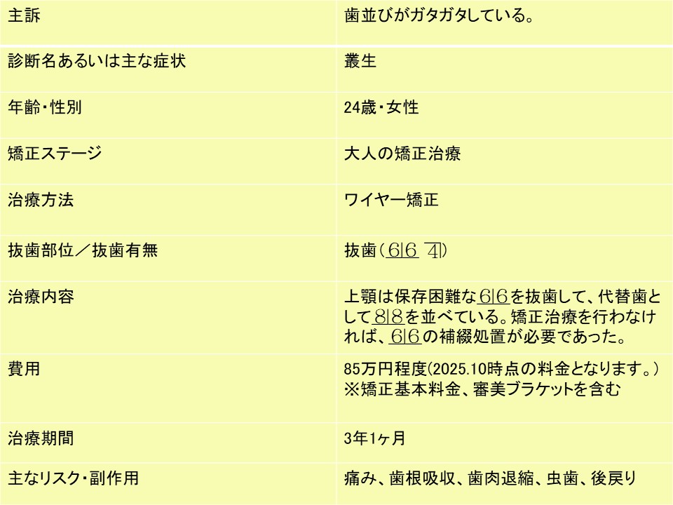 ※上顎は上顎の第一大臼歯が保存困難であることから、抜歯を余儀なくされたが、下顎は、ガタガタの改善と、歯列の真ん中を顔面そして上顎にそろえるため、抜歯が必要となった。