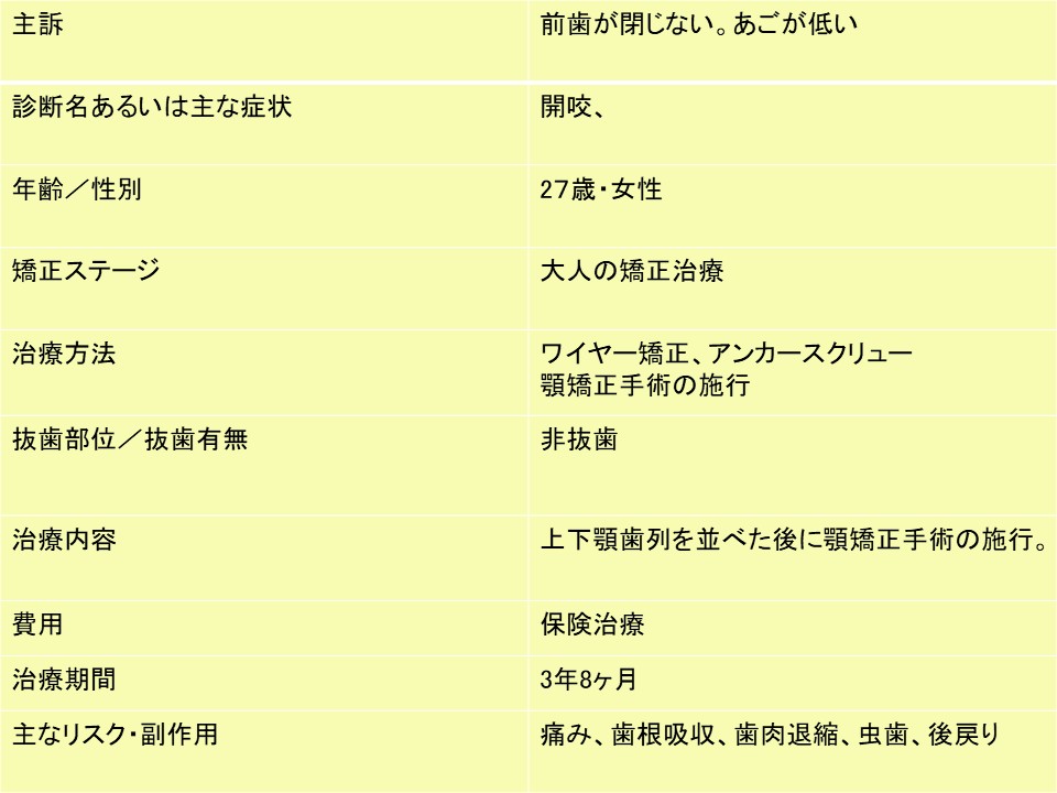 ※本患者は矯正治療単独での治療についてもアンカースクリューの使用で可能ではありましたが、患者様は顔貌の著しい変化をご希望されていたため、外科的矯正治療を選択させていただきました。