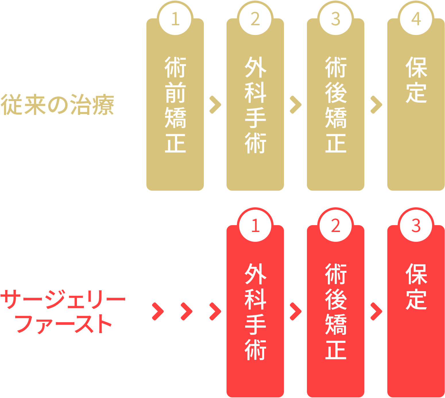 従来法では術前矯正に1~2年かかる場合がありますが、サージェリーファーストでは、その期間が短縮され、全体の治療期間を短くできます。